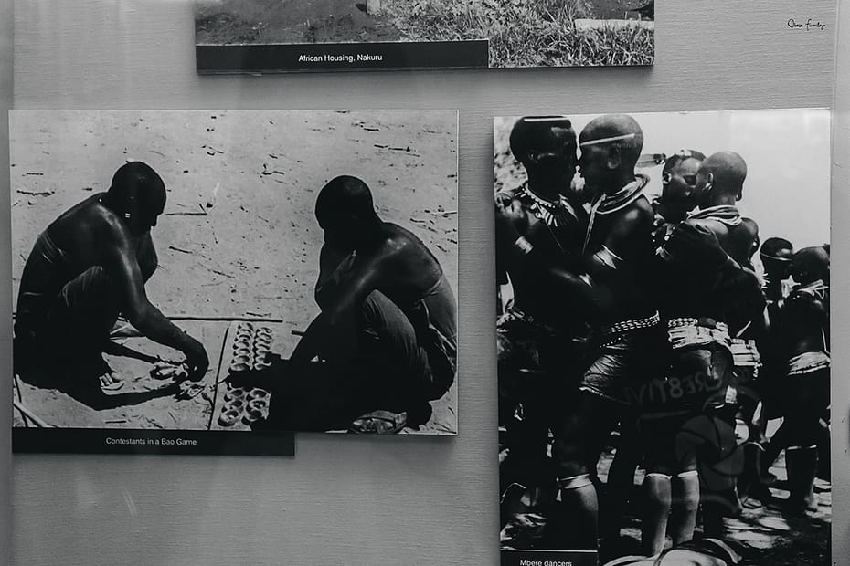 The frame on the left is an image of two men playing the Bao game while that on the right is an image of men and women from the Mbere clan, in Eastern Kenya dancing. Both are reveling on practices that were widely spread across Africa but are now, unfortunately almost defunct. The men in the left play a traditional board game, one of Africa’s antiquities, while the dancers writhe in a movement of spirituality, a reminder of the roots, and appraisal of a culture that took place before the internal expansion of imperial and colonial Europeans.