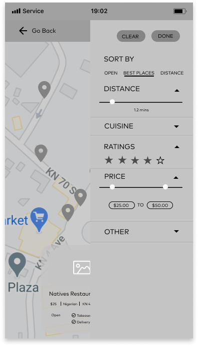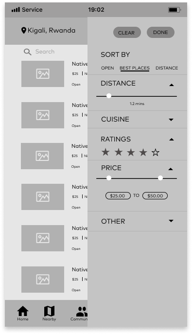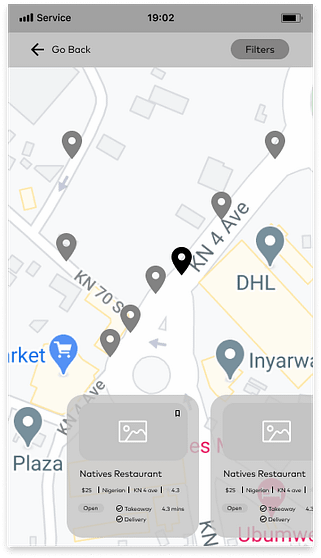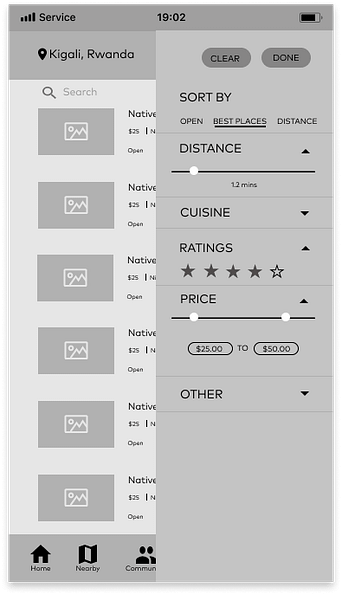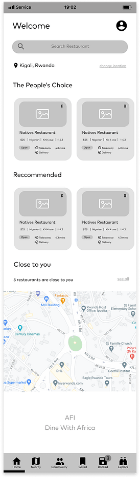 Users are now able to find restaurants that serve African cuisine with google maps. For easy access, I designed a nearby option located in the navigation bar. Users can easily access restaurants according to their location.