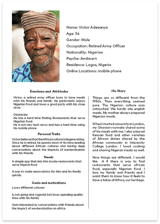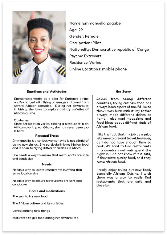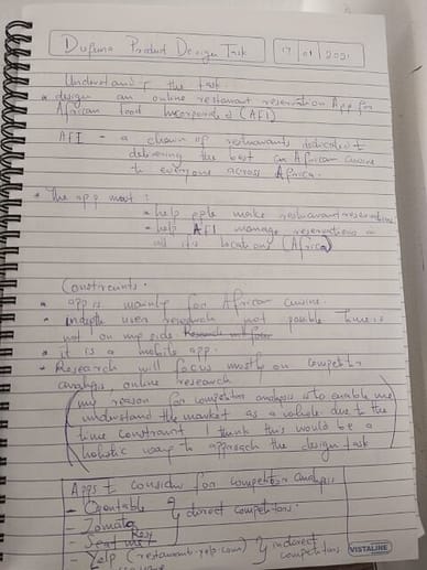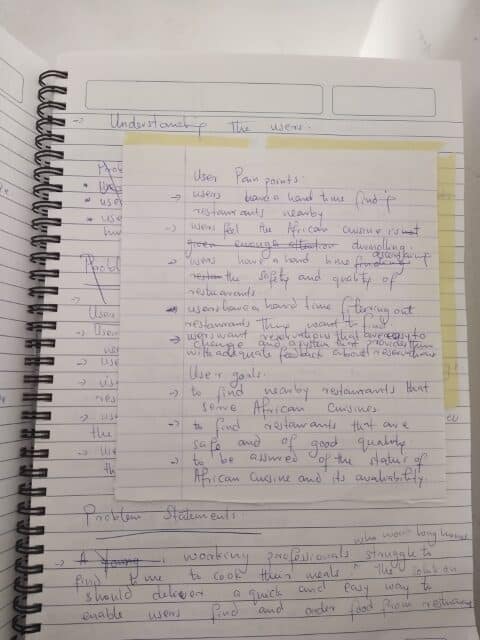 I also interviewed two users and gleaned user reviews of competitor apps. My user research focused on the users’ workplace, how they choose restaurants, and what they think about African cuisine. Interestingly, I found that the users I interviewed felt that people looked down on African cuisine.