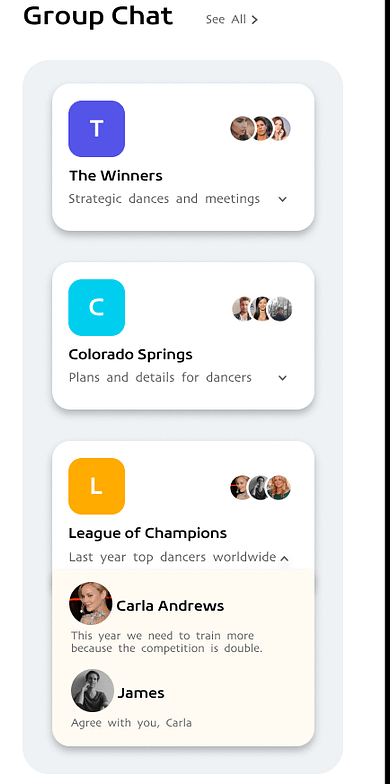 Solution: I added arrow icons in all group chat cards. The icons give users a hunch about how it can expand if they clicked on it.